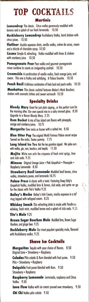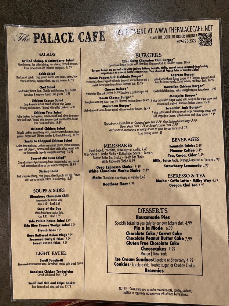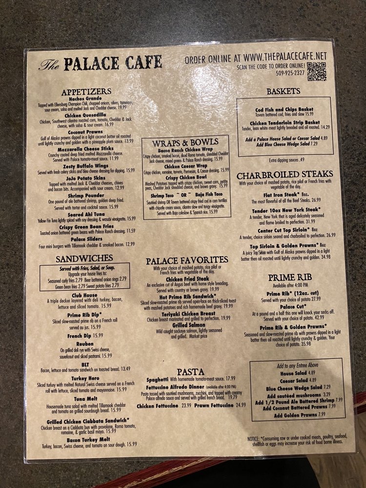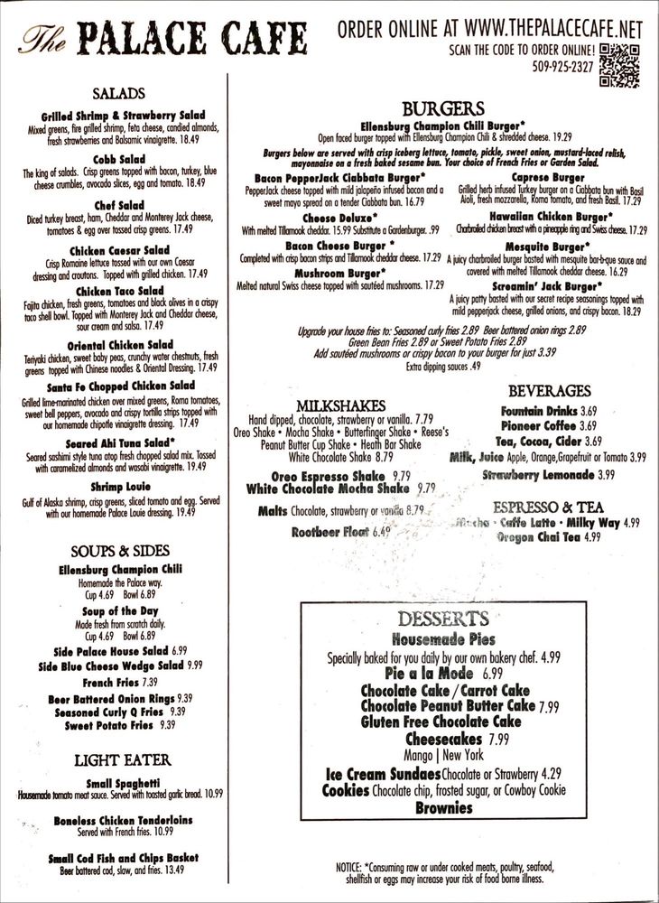 Introducing the menu at Palace Cafe offers a wide range of American breakfast and brunch options, with a focus on quality ingredients and diverse flavors. The restaurant provides a welcoming atmosphere with options for vegan and limited vegetarian diets, making it inclusive for all patrons. From beer-battered onion rings to coconut prawns, the appetizers showcase a creative blend of flavors and textures. The salads are fresh and hearty, like the Chef Salad with deli turkey and Chicken Caesar Salad with grilled seasoned chicken breast. The soups and sides are made from scratch daily, including Ellensburg Champion Chili and Palace House Salad. Palace Cafe's menu truly caters to a variety of tastes and preferences, making it a must-try destination for any food enthusiast.
